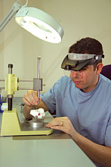 When the jobs are received from the Model Department the prescription is read and the preps are trimmed under magnification with a special burr. This is to remove any excess soft tissue from the margin. This enables us to clearly identify the margins of the crown.